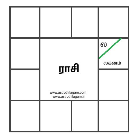 ஒரு ஜாதகத்தில் இடம் பெறும் ராசிக் கட்டத்தில் ‘ல’ என்றோ, அல்லது ‘லக்’ என்றோ, அல்லது ‘லக்னம்’ என்றோ குறிப்பிட்டிருக்கும் ராசியே முதல் வீடாகும். இங்கே கொடுத்திருக்கும் ராசிக் கட்டத்தைப் பாருங்கள்.